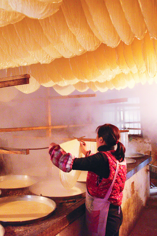 近年來隨著市場化改革的推進,傳統做腐皮的作坊越來越少,我們多次前往嵊州崇仁鎮尋找腐皮的制作都無功而返,后能夠見到大規模的用傳統制作工藝制作腐皮的場景,實屬難得。能讓餐桌上多一道傳統的素食美味,制作腐皮這種傳統工藝得以保持不可缺少,可惜這種作坊太少了,就剩下該鎮西青村在做了。我們到訪時,周圍幾家都已停工,爐火也熄了,只有這家還開著,但每年也只是在春節前做幾個月而已。