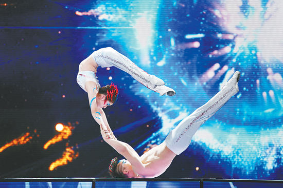 分別代表冰與火的男女雜技演員,在高高升起的舞臺上,配合著背景LED大屏幕展現的炫目圖像,恬靜中不失霸氣地用多個高難度姿勢展示著常人難以企及的柔韌、平衡、力量等絕技,以震懾全場的氣場,令觀眾屏息凝神且提心吊膽,匪夷所思又心悅誠服。節目以LED背景中極光照耀與冰火交融的瞬間,男女演員猛然相擁入懷結束,象征著冰與火最終打破了時空的運轉規律,歷經沖突、碰撞而歸于平靜、和諧,深刻地詮釋著冰與火、男與女、陰與陽、剛與柔、動與靜等事物兩極的對立、溝通、妥協、平衡與和解,引人回味、遐想。