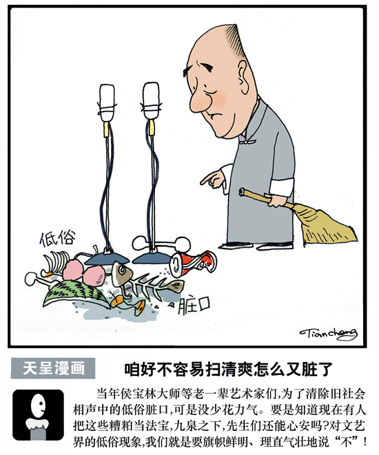 當年侯寶林大師等老一輩藝術家們,為了清除舊社會相聲中的低俗臟口,可是沒少花力氣。要是知道現在有人把這些糟粕當法寶,九泉之下,先生們還能心安嗎?對文藝界的低俗現象,我們就要旗幟鮮明、理直氣壯地說“不”! 天呈漫畫