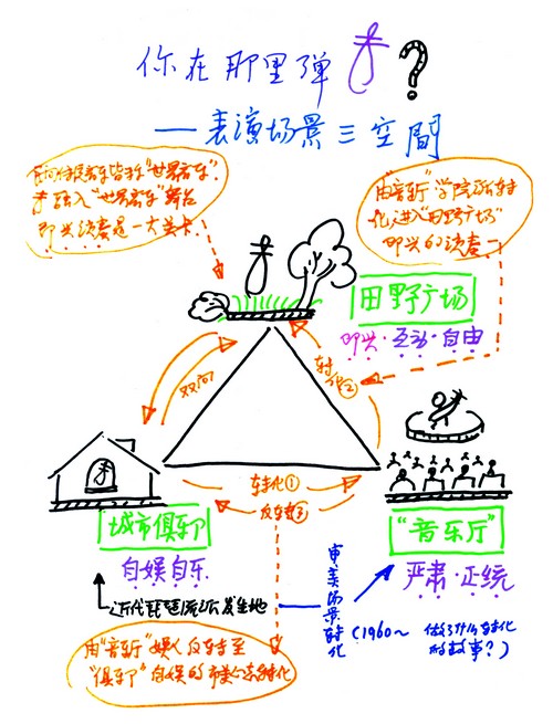 還有很重要的一點,我們每個音樂家都應該自問我在哪里演奏?我們音樂家最習慣的一個空間就是音樂廳,其實我們有很多室內民間器樂,比如古琴、琵琶,多在城市俱樂部、文人雅士聚集之地演奏,而民族管樂嗩吶等多在廣場。我們現在多是單一的音樂廳,其實對音樂本身來講就帶來極大的限制。我提倡表演場景的三個空間(參見本文插圖),也是希望審美場景的轉化,比如音樂廳是嚴肅正統的,以娛人為主,把觀眾作為上帝,老百姓喜歡什么我們演奏什么,去迎合,這一點始終是誤導,老百姓也需要我們去引導,現在也不提這個了。的確進入音樂廳,更完整了,不粗糙了,往往自娛自樂的東西也沒有了。而城市俱樂部,其實是反轉為自娛自樂,我認為這點對民族民間音樂十分重要,我在1960年前演奏多是在這種城市俱樂部,非常自由。而到了田野和廣場上,就是互動了,2010年我去日內瓦演出,在音樂廳下午的正式演出后,晚上我與當地的阿拉伯彈撥樂的樂師一起在廣場上即興表演,現場很瘋狂啊。人的瘋狂其實是人的本性,是藝術的自由狀態,“即興”自然而然就出來了。我認為,演奏中“即興”是特別重要的狀態,我也在培養學生這一點,東西全在譜子上,的確是規范的,但是離開譜子什么都抓不到,沒有那種即興、自由的鄉土味道。