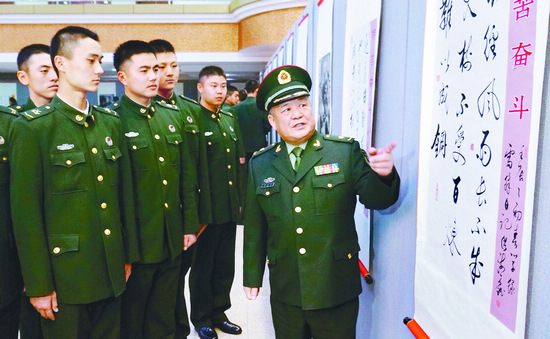 軍事博物館書畫院常務副院長、軍旅書法家李洪海從閱讀《雷鋒日記》過程中獲得啟發(fā),從中節(jié)選出50條最精彩、最閃光的語錄片段,用書法的形式、書法的語言、書法的意境,精心創(chuàng)作了50幅書法作品,并由長城出版社集結出版。圖為李洪海在贈書儀式后向官兵們介紹自己創(chuàng)作的作品。