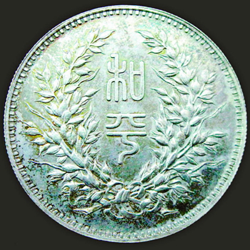 先說幣本身,就其做工和蘊意來說,此幣是由意大利著名雕刻師魯爾治·喬治雕模,做工精巧,人物栩栩如生。銀幣正面鑄段祺瑞半身西服像,上鐫楷書“中華民國執政紀念幣”九字,背面中央鐫篆書“和平”二字,反映了當時的民之心聲——和平。此幣是段祺瑞就任民國執政時用于饋贈參加其就職典禮的各界嘉賓的,彰顯出他的執政理念是順應民意所求的“和平”。此幣“和平”二字用嘉禾圖托之。“嘉禾圖”是指生長得特別茁壯的禾稻,古人視嘉禾圖案為吉祥的象征。