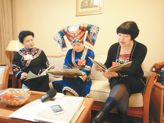 姚曉英(右一)與同團(tuán)兩位人大代表商討議案