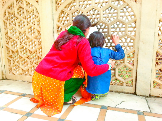 阿格拉紅堡 這是莫臥兒國王薩·賈罕被皇子囚禁之地,據說薩·賈罕總是站在城樓的一邊遠眺著他親自設計并下令建造的泰姬陵落淚。圖為站在城樓的缺口處的印度媽媽對女兒講述薩·賈罕眺望泰姬陵的故事。