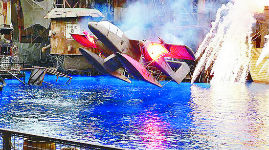 無獨有偶,在另一座小水池里,演繹著幾位勇士在“大西洋”上與海盜們周旋、搏戰,他們駕駛著摩托艇,在碼頭和加勒比海盜船之間的“驚濤駭浪”中飛速穿梭,忽而持槍射擊對方,忽而從高處跌入水中,忽而冒死救援戰友,緊張激烈,險象環生,又不乏幽默風趣,最終戰勝海盜,精彩表演激起觀眾歡呼雀躍。