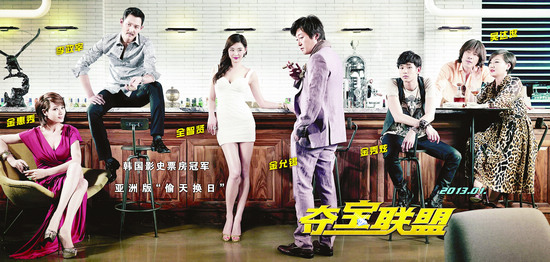 2013年1月15日,《奪寶聯(lián)盟》作為新年第一部分賬電影進(jìn)軍中國。中國進(jìn)口公司火山石影視通過中國電影集團(tuán)在國內(nèi)3000多家影院上映。如同《晚秋》擁有湯唯和玄彬這兩個(gè)有國際影響力的實(shí)力派演員,《奪寶聯(lián)盟》同樣使用韓港兩地的頂尖演員,可以說是影帝影后大集中。主要的香港演員有:香港金像獎(jiǎng)影帝任達(dá)華,臺(tái)灣金馬獎(jiǎng)、香港金像獎(jiǎng)影后李心潔,實(shí)力演員曾國祥(曾志偉之子);韓國演員有:韓國大鐘獎(jiǎng)影帝金允錫,韓國青龍獎(jiǎng)影帝李政宰,韓國三屆青龍獎(jiǎng)影后、一屆大鐘獎(jiǎng)影后金惠秀,在韓國大鐘獎(jiǎng)和青龍獎(jiǎng)都曾獲得最佳女配角獎(jiǎng)的“國民媽媽”金海淑,韓國大鐘獎(jiǎng)影后“野蠻女友”全智賢,實(shí)力派演員吳達(dá)庶,韓國人氣偶像、電視百想藝術(shù)大賞最佳男演員金秀賢。擁有十位亞洲實(shí)力派演員加盟的《奪寶聯(lián)盟》,在故事架構(gòu)和敘事編排上也頗具好萊塢巨制的氣勢。影片輾轉(zhuǎn)于韓國、香港和澳門三地拍攝,十位主要演員以群像的形式在電影中呈現(xiàn),影片中的盜賊形象沒有臉譜化、模式化,而是個(gè)個(gè)身懷絕技,每個(gè)人都個(gè)性鮮明,立體飽滿。《奪寶聯(lián)盟》與之前廣受好評(píng)的《漢城大劫案》《老千》被視作導(dǎo)演崔東勛的“崔氏犯罪三部曲”。并且,這三部電影都是高智商犯罪電影的代表之作,集立意新穎、懸疑推理、華麗動(dòng)作為一體。