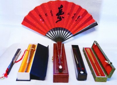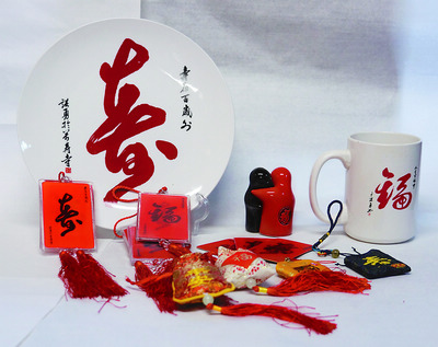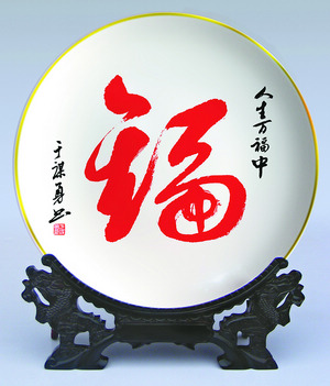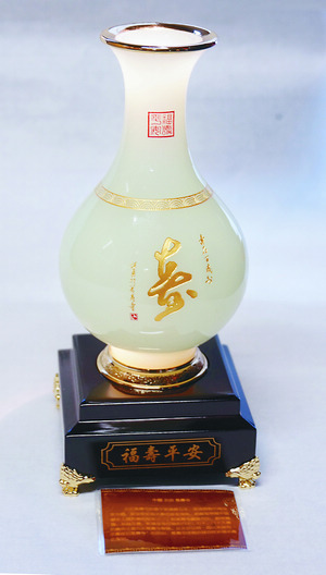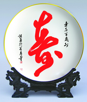 于謀勇福壽字一筆書被開發成藝術產品,從上至下分別為:“?!弊执杀P、“壽”字瓷盤、福壽瓶藝術品、福壽掛件藝術品、福壽扇面藝術品