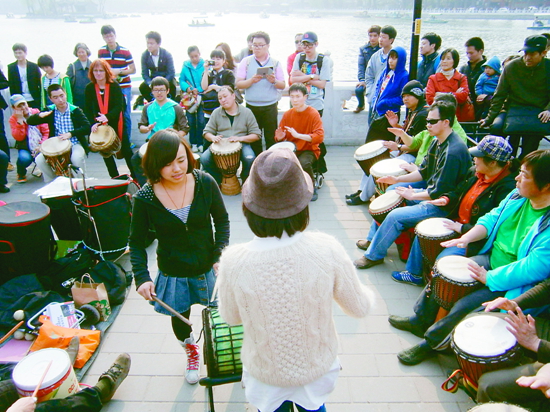 這種來自非洲的原始樂器,在一系列中外樂器中幾乎排不上名次,甚至在各個正規(guī)的音樂劇場難登大雅之堂,卻從非洲本土發(fā)展到美洲,又從異國引進(jìn)中國,跨地域跨文化跨種族,像一朵小花在中國民間滋生旺盛成為氣候,吸引不少年輕人學(xué)習(xí)操作,它的魅力何在?參加“鼓聚”的鼓者說:學(xué)習(xí)非洲鼓門檻低,演奏方式容易掌握,幾乎每個人都可以參與。不同職業(yè)不同年齡性別的人坐在一起打鼓,大家在鼓聲中尋求統(tǒng)一的節(jié)奏,找到聲音的共鳴。非洲鼓打起來那種震撼魂魄的激情,會讓我們這些在文明中浸染太久的東方人,有一種自然的渴望和沖動。一位年輕女教師說:“我很小的時候?qū)W過電子琴,后來就沒時間練琴了。但自從每個周日來后海參加‘鼓聚’,我的興致和積極性很高。打鼓的時候會很專注,注意力集中,人的情緒通過復(fù)雜的節(jié)奏得到釋放宣泄,身心在鼓聲中減壓。所以忙碌了一個星期,很期盼周末來這里享受‘鼓聚’。”一個外號“笨鳥”的中年男人是鼓聚的“老人”,每次“鼓聚”,他打得最盡興。但他的鼓不是正宗非洲鼓,而是鐵皮的化工油漆桶。旁人看著有點(diǎn)搞笑,但他說,鼓打到一定境界,盡興的已經(jīng)不是手下打的是什么鼓,而是你全身心體會和沉浸于擊打的過程。