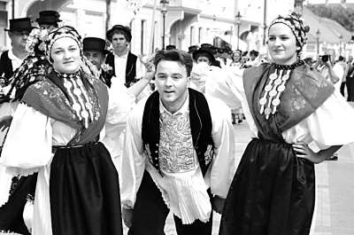 光明日報薩格勒布5月6日電 克羅地亞文化部官員宣布,該國南部斯拉沃尼亞地區特有的一種有著豐富地區特色的歌舞形式“貝查瓦”被聯合國教科文組織正式確認為非物質文化遺產。表演“貝查瓦”時,穿著民族服裝的當地村民用兩個完全不同調的聲部來演唱一首歌曲,一個聲部的歌詞表達生活的美好,另一個聲部則用詼諧的詞句來描繪生活中的有趣景象,演唱者同時跳起舞蹈。圖為當地人在邊唱邊跳“貝查瓦”。