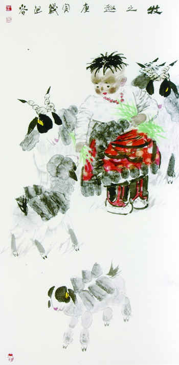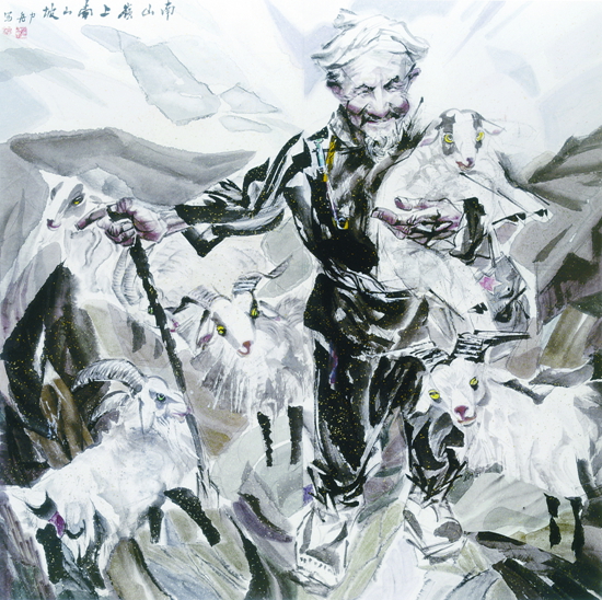 從上世紀80年代開始,楊力舟在田園詩韻黃土情與縱橫逸筆追雄風中,在大寫意筆墨境界中吸收西方表現主義和立體構成,在民族風情領域發揮骨法用筆與奔放色彩、張揚豪邁氣概。借鑒了立體派和未來派的構成、重疊和夸張變形手法與狂放的色彩,將黃土高坡上的淳樸滄桑、賽馬場上英姿颯爽的駿馬和騎手,表現得淋漓盡致。王迎春堅持傳統筆墨深厚的優長,立體構成的畫面設計和金石古風、活潑生動的筆墨情趣都彰顯出她對人文精神博大而深沉的關懷。僅從他們兩人都鐘愛的對“羊”的表現處理上,我們就能感受到他們在形式語言上的區別:楊力舟畫羊用大筆觸寫出,強調筆力;王迎春用沒骨畫法,重視用筆墨的虛實,體現立體和空間,強調黑白灰節奏和對比。