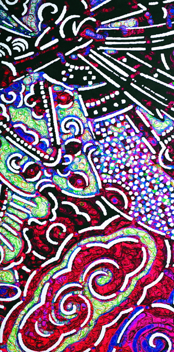 “回歸本元·潘魯生當代藝術巡回展”展出的四個部分,是潘魯生藝術創作和學術研究重點關注的領域。“門神納福”作品系列,通過纖維藝術、裝置藝術的形式,對民間年畫門神這一創作母題進行再創作。“門”是一個界域進入另一個界域的符號;門神則暗含了樸素的吉慶祥瑞的民間觀念,將民間傳統的審美趣味引入當代人的審美空間。這正是潘魯生多年來學術研究和藝術創作所著力的支點。