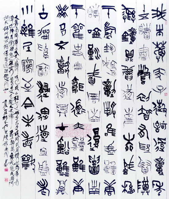 “簡帛書是個好東西,我也是受益者。它相對于傳統的大篆、隸書等金石碑版來講,由于墨跡多是民間寫手所為,有鮮活生動、流暢自然、率意樸拙的特征,但同時存在著尖、薄、浮、糙等流弊。因此,學習簡帛書要有所取舍,建議初學者還是要打下小篆、大篆的基礎后再去接觸它,走融會貫通之路。我是在掌握金文和簡帛書差異的基礎上,用金文的筆法來融會簡帛書,把掌握金文的用筆作為學習簡帛書的切入點,同時在文字取法上避繁就簡,摒棄過于生僻結字的簡帛書,形成了當下這種帶有簡帛書意趣的大篆書風。”高慶春介紹。