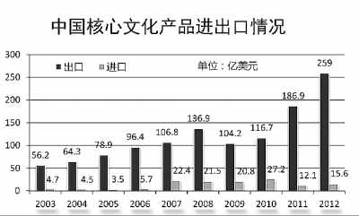 “十一五”期間,我國核心文化產品進出口從102.1億美元增長到143.9億美元,年均增長9.0%;我國文化服務進出口從26.6億美元增長到57億美元,年均增長19.5%。文化產業快速發展,文化貿易及文化“走出去”規模日益擴大,但與我國在世界政治經濟體系中的地位和作用相比,與中華文化的悠久歷史和巨大魅力相比,我國對外文化貿易和“走出去”的規模還有待進一步提高。
