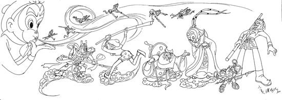 作為中國動畫的參與者與見證者之一,浦稼祥老先生先后參與了《烏鴉為什么是黑的》 《驕傲的將軍》 《小蝌蚪找媽媽》 《大鬧天宮》 《哪吒鬧海》等經典動畫作品的人物創作和造型設計,并導演了《松鼠理發師》 《老虎裝牙》等獨具個人風格的動畫短片,給大小觀眾留下了深刻的印象。時隔50年后,浦老精心繪制的畫作再次將我們帶入《大鬧天宮》的神話世界,充滿創意的構圖,將悟空對戰二郎神、巧遇土地公以及大戰哪吒的經典場景巧妙地貫穿一體。