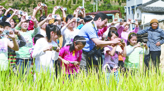 杭州市攝協志愿者分團為偏僻的山村小學建立了攝影學校,圖為攝影家指導孩子們學習攝影