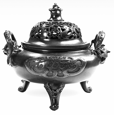 訪遍了各大博物館、古玩市場,翻遍了無數的典籍、資料,陳巧生逐一摸索出失蠟法工藝的10多道工序,包括制圖、雕蠟模、裝澆口、上料、煮蠟、烘烤模、澆鑄打磨和做舊等,“要全手工制作,做一只香爐要耗時一個月左右,每道工序都很關鍵,其間不能有一絲一毫的疏漏,否則要一切推倒重來。”