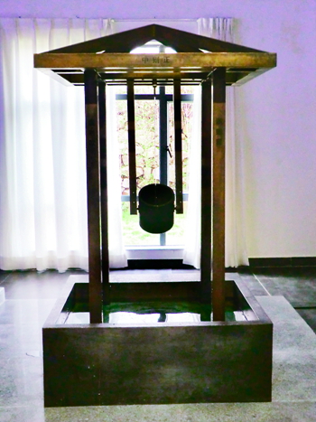 夏和興的《觀器論道》,走“極簡(jiǎn)”風(fēng),四根鐵條搭出架子,中間懸置水桶,架子上刻“虛則欹,中則正,滿則覆”的文字,水流過(guò)歪斜的空桶,將它灌平,持續(xù)注水,則水桶傾覆——這一來(lái)自《荀子·宥坐》典故與靈感的雕塑作品,讓人想起“謙受益、滿招損”和“日中則移,月滿則虧”的中國(guó)古語(yǔ),又與仰韶文化的尖底瓶在6500年之后遙相呼應(yīng),成為近日在深圳坪山雕塑藝術(shù)創(chuàng)意園,由中國(guó)雕塑學(xué)會(huì)等單位主辦的2013中國(guó)雕塑學(xué)會(huì)20年優(yōu)秀雕塑作品回顧展上頗受矚目的作品。