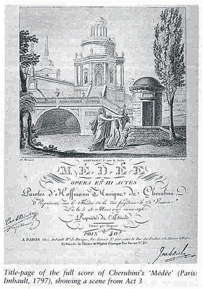 《美狄亞》(Médée) 是凱魯比尼最著名的歌劇作品,劇作源自希臘悲劇大師歐里庇得斯的《美狄亞》及法國劇作家皮埃爾·高乃依(Pierre Corneille)的《梅德》。1797年巴黎首演。1809年,凱魯比尼在原作基礎上刪去了約500小節,寫成了一個精簡版。此后被不斷改編。歌劇同名主角便一直被視為女高音演唱實力的艱巨挑戰。其中比較有名的改編是女高音瑪麗亞·卡拉絲在1953年演出的版本。