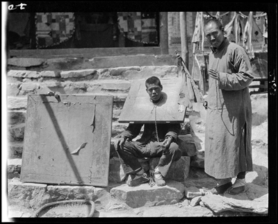 自戴刑具還愿者(舊時窮人祈愿成功后,用這種方式向佛祖還愿)。