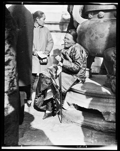 在甘博的相機下,一百年前北京居民的生活被一一展現。有一張圖是一個纏足的老太太穿著綾羅綢緞,戴著男人的瓜皮帽,手中拄著文明棍,嘴里還叼著煙嘴。“這種多種文化的劇烈沖突,只有在民國初年才找得到。”韓樸說。