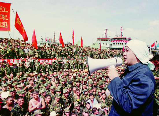 1998年,時為解放軍總政歌舞團演員的黃宏在堵死的九江市長江大堤潰口處演出,慰問搶險官兵。中新社 趙振清 攝
