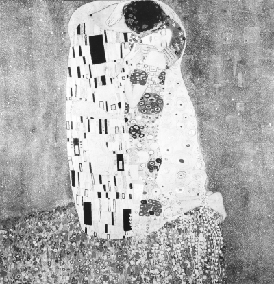 跪在花園中相互擁抱的男女,在微光中被金色的光芒纏繞著,姿態動人。金色的光似孔雀尾羽一般,從女人的足跟灑落,男人抱著女人,熱烈的親吻。但是,女人卻在沉醉于愛的同時,浮現出羞怯、甚至好像想阻止男人愛撫的表情。這幅畫是克林姆的代表作《吻》,畫面上充滿了性的矛盾和奇異的壓迫感。