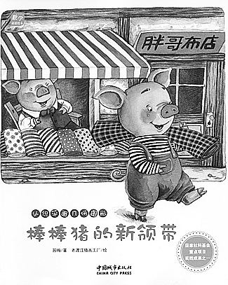“蘇梅童話繪本系列”圖文并茂,是作家、畫(huà)家通力合作的成果。我看了這套繪本,深切地感到它既是用語(yǔ)言文字講故事,也是用圖畫(huà)講故事,可說(shuō)是文字、繪畫(huà)并重,各自用不同的方法、手段來(lái)表現(xiàn)故事的同一個(gè)主題,兩者的融合渾然一體。畫(huà)家的作品精致、清新、特色鮮明、富有個(gè)性,不僅貼切、完整地表達(dá)了作家提供的文本內(nèi)容,而且挖掘了、更加突出了故事中一些生動(dòng)有趣的情節(jié)、細(xì)節(jié),從而更充分地發(fā)揮了繪本的藝術(shù)魅力。例如,在《棒棒豬的新領(lǐng)帶》中跳跳猴彎著腰、低著頭從褲襠下倒著看棒棒豬為他縫補(bǔ)好了的褲子的畫(huà)面,突出那兩個(gè)圓形大洞,巧妙地融入數(shù)學(xué)知識(shí),傳神、幽默、好玩,富有想象力,增強(qiáng)了作品的藝術(shù)效果。
