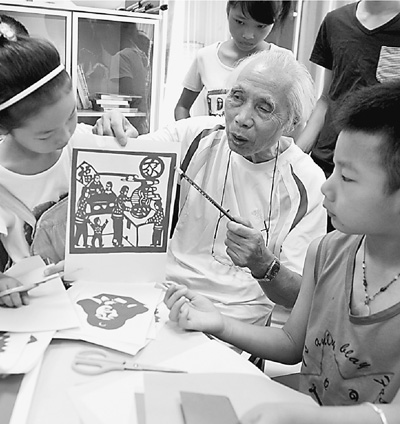 7月9日,安徽省非遺傳承人馬佳軒(右二)在給孩子們講解剪紙制作技藝。