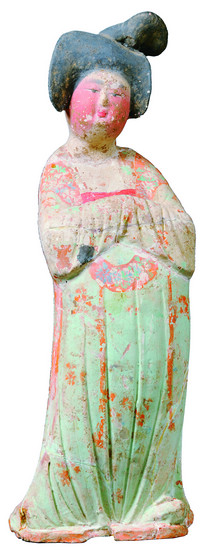 出土于西安市長安區茅坡唐墓的彩繪拱手仕女俑,梳拋家髻,面龐紅潤,肥胖而不臃腫,身軀微微扭轉,右肩略抬起,朱唇含笑。