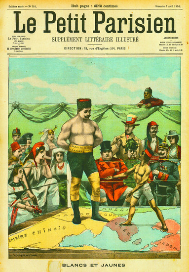 “這是一個不公平的擂臺。”1904年4月3日Le Petit Parisien增刊用漫畫的夸張手法道出了這樣的事實。圖片很巧妙地用摔跤擂臺來表現當時歐洲人眼中的世界局勢以及看待日俄戰爭的態度。臺上看似實力懸殊的兩名參賽者,分別站在自己所屬的領地上,左方高大魁梧的俄國選手,腰上背著“歐洲冠軍”的黃金腰帶,俯視著身高不到自己腰部的對手。右方瘦小的日本選手,運動短褲上寫著磨損殆盡的“亞洲冠軍”,腳步橫跨在日本和朝鮮半島間,好像已經用了不少力氣,卻仍然抬頭叫囂,雙手擺出挑釁的姿勢。而圖右上方的中國面對日俄兩國在自己的土地上廝殺,卻只能對外宣稱“局外中立”,連進場觀戰的資格都沒有,只能攀附在圍墻邊偷看。