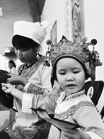 7月11日,北京798時代空間,祖孫三代在展示水族馬尾繡。當日,“2013多彩貴州·民族民間手工藝品走進北京”展覽開幕,上百年的蠟染珍藏品以及刺繡等一批貴州非遺精品與觀眾見面。