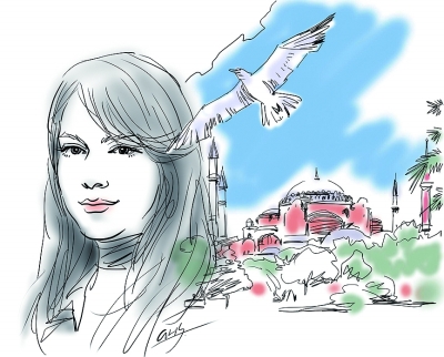 幾年前,我有幸參加了在土耳其首都安卡拉舉辦的第四屆安卡拉國際藝術論壇,有機會感受這個國家的蓬勃活力與歷史的文明印記。論壇上來自中國的藝術作品吸引了眾多土耳其參觀者。記得一位土耳其女青年對我的一幅畫作《紫禁城的橋》很是欣賞,連續兩天都出現在這幅畫前。《紫禁城的橋》畫面描繪的是一位身著現代民族服飾、身形窈窕的女子背影,自信地漫步于紫禁城橋畔,畫面色彩由藍、紅、草綠、金等色塊構成,古代傳統的裝飾紋樣點綴其中,使畫面呈現一種東方的華麗之美。這位土耳其女青年說,從這幅畫作中深切感受到了當今中國社會的風貌,也領略到中國悠久的歷史和燦爛的文化,對中國藝術家的表現技法與藝術語言同樣感到驚奇與欣賞,非常希望能有機會到中國旅行,到中國的藝術家中去交流現代藝術。我為這位藝術女青年充滿活力的談吐所感動,現場為她作了速寫肖像畫,當她接過畫時竟然興奮地歡跳起來。周圍更多的參觀者圍攏過來,都希望得到一幅中國人為自己所作的速寫肖像。
