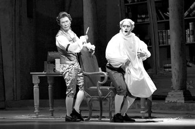 廖昌永(左)在《塞維利亞理發(fā)師》中扮演“大忙人”理發(fā)師費(fèi)加羅。 王小京 攝