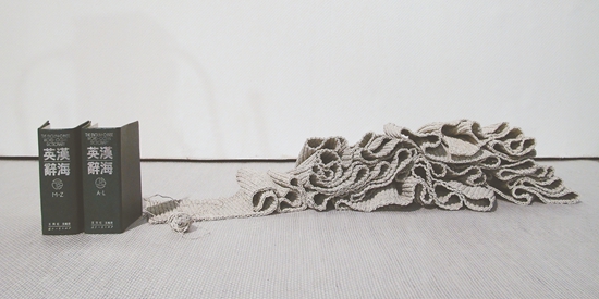 在北京和上海舉辦的“漸”展覽中,王雷用英漢詞典的書頁編織成巨大的圍巾,這是一件既宏大又值得仔細品味的作品。策展人吳洪亮認為,編織的手藝起初是為豐富人們的衣裝,在不斷發展中逐漸成為一種藝術語言,如古代的緙絲、織錦以及掛毯等,從生活實用功能產品升華為賞心悅目的藝術品。王雷所展示的兩個書殼和織物,猶如金蟬脫殼的概念,書中的紙張得到了一種新的升華。王雷想要通過“托物言紙”、“偷梁換柱”等系列作品,重新看待身邊的事物。