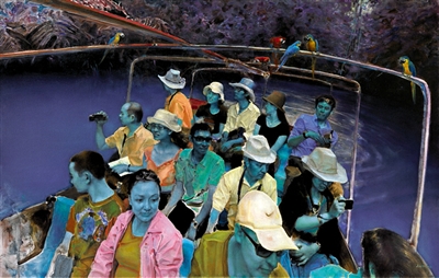 展覽展出了龐茂琨的油畫、手稿等多種媒材的繪畫作品50余件。據龐茂琨介紹,這些新作是在過去近三年,他作為四川美院副院長的工作之余抽空完成的?!白?010年上海個展之后,我希望在肖像性的創作基礎上尋找場景性語言,尋找素材時我發現來自于生活的照片很有趣,在現實中具備了這些荒誕的感慨。”龐茂琨于是將照片搬上布面,創作了諸如《鏡花緣》系列的布面油畫。為了表達“戲劇化的情景”,龐茂琨特意改變了固有的色調,轉而使用紅、綠、藍等大膽顏色建立了一種新的色彩秩序。
