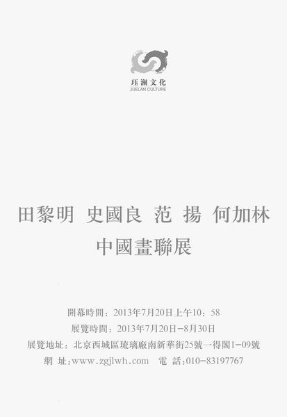 2013年7月20日,“禪境明心 泛游山林——田黎明、史國良、范揚、何加林中國畫聯展”在北京琉璃廠玨瀾畫廊開幕。展出田黎明、史國良、范揚、何加林中國畫精品50余幅,涵括人物、山水、花鳥,充分顯現出他們精湛的藝術水準和個性面貌。