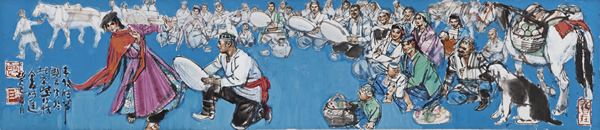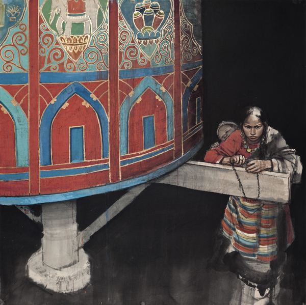 史國良先生則堅持了傳統中國人物畫“線條的雄辯”。他慣以簡練的線條和鮮活的色彩描繪生活,作品中洋溢著濃厚的生活氣息,彰顯著人性的光輝,是徐蔣體系寫實主義的升華與再造。展覽作品中跨度從上世紀90年代初的《姐妹》、《轉經》到2013年的《豐收時節》,顯示了史國良繪畫作品中一直存在的兩面性---對入世的體悟與對出世的尊崇,以及他對生活的熱愛和對宗教的虔誠。