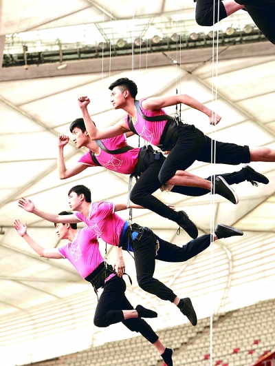 國家體育場“鳥巢”將于9月12日至10月7日上演大型劇目《鳥巢·吸引》,該劇目融合戶外全息成像技術、巨型高空水幕、3600平方米遞進式懸空LED以及高空鋼絲表演等元素,為觀眾呈現一場人與科技相融合的演出。圖為7月23日,在國家體育場內,演員們正在進行吊鋼絲排練。 新華社記者 李文攝
