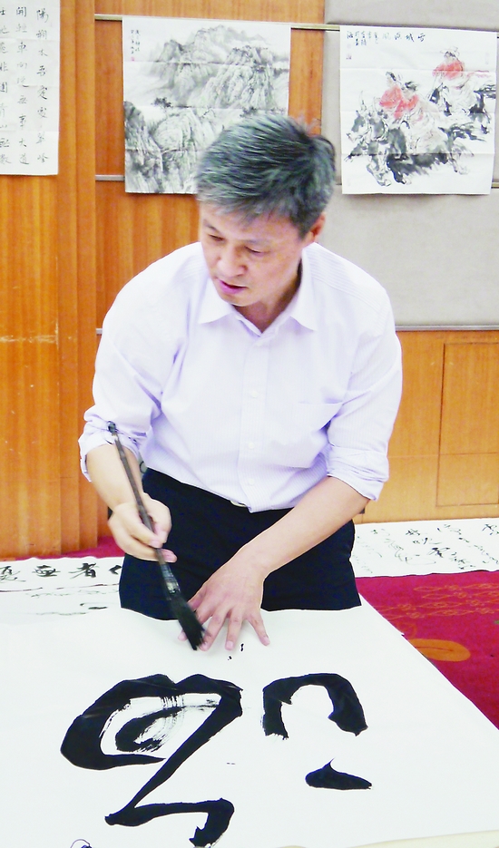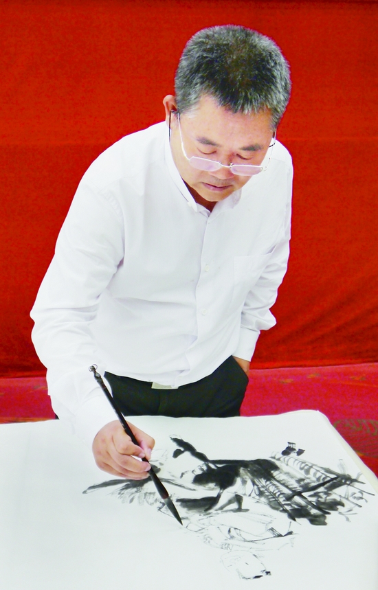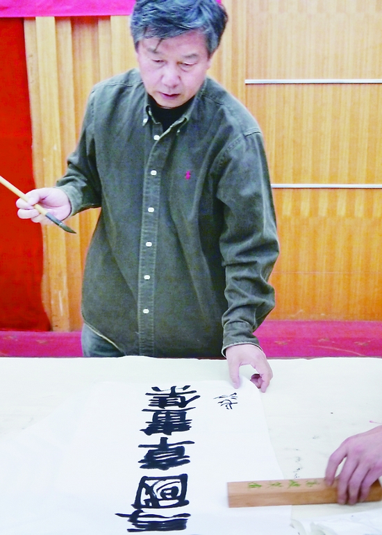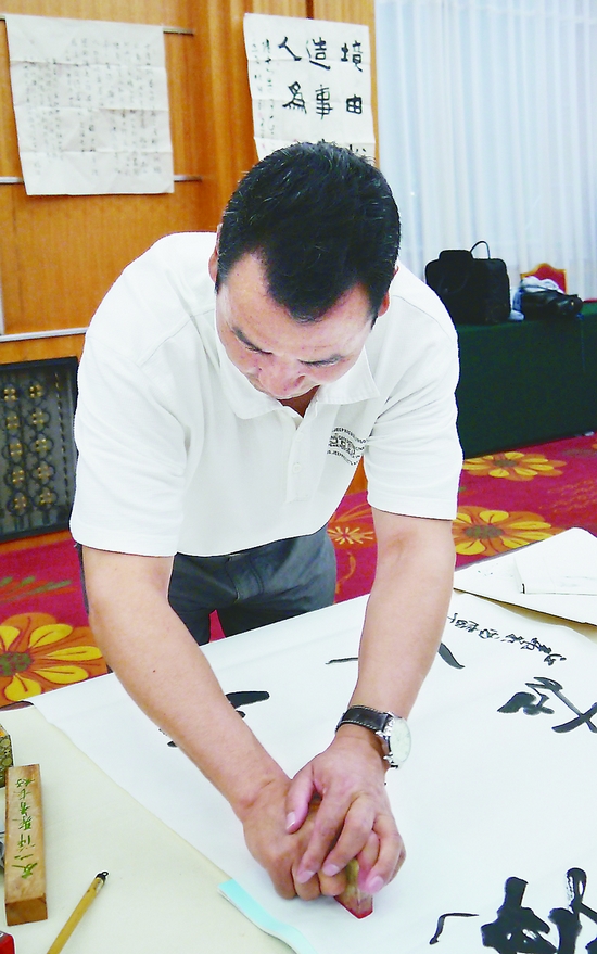 參與慰問活動的美術、書法家們為災區創作并捐贈作品,還為當地文藝家進行輔導。圖為著名書畫家吳長江、陳洪武、陳鈺銘、郭正英在慰問筆會上創作。