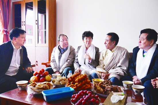 趙實等看望慰問玉樹老文藝家昂嘎。圖為趙實和青海省委常委、宣傳部部長吉狄馬加,中國文聯副主席、中國音協分黨組書記、駐會副主席徐沛東,以及青海省文聯主席、黨組書記班果等與老人熱烈交流。