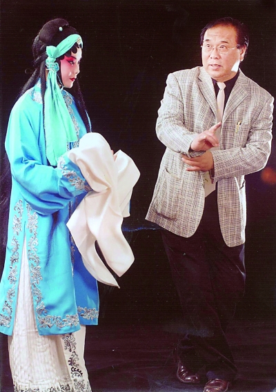 石磊(右)在指導(dǎo)梅花獎(jiǎng)得主徐俊霞排演他所編劇的《女貞花開(kāi)》。