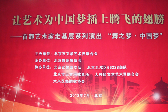 據悉,7至9月間,市文聯主辦,舞協、音協、曲協、雜協分別承辦的以“讓藝術為中國夢插上騰飛的翅膀”為主題的首都藝術家走基層20場系列文藝演出活動,還將深入農村、社區、部隊、醫院、學校、廠礦企業進行多場演出。此次系列文藝演出活動,旨在貫徹落實中央、市委關于做好“中國夢”宣傳教育精神,通過組織首都藝術家走基層,用藝術的形式宣傳詮釋“中國夢”,充分展現當代中國人民追夢、筑夢、圓夢的豪邁氣概和美好情懷,向人民群眾傳遞昂揚向上、奮發進取的正能量,同時也是貫徹落實黨的群眾路線教育實踐活動的具體行動。
