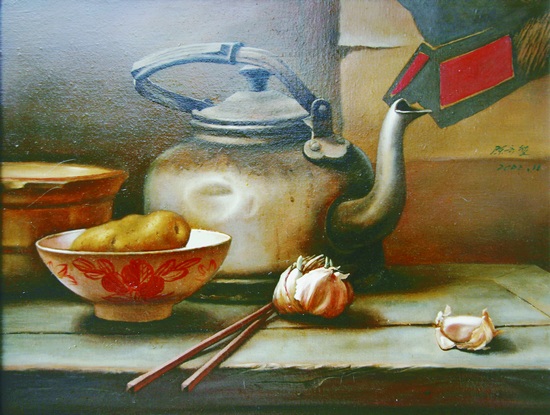 陳齊堃自幼酷愛美術,由于命運錯位,沒有機會進入專業畫家的行列。他無法抵抗畫筆的誘惑,癡迷、勤奮,執著于自己的藝術道路。他的作品樸實、直白、真誠,沒有張揚的筆觸,沒有炫耀的色彩,他用目光凝視著引他思索與回憶的那些沉重而苦澀的歷史生活舊物,借用西方油畫靜物的表現手段,不夸張、不渲染,真實地記錄下具有強烈時代印記的生活。他希望通過幾件簡單的物品做素材,將一個個歷史瞬間如實呈現出來。他以普通人的視角、平常人的心態,在平凡的生活中尋找美、發現美。