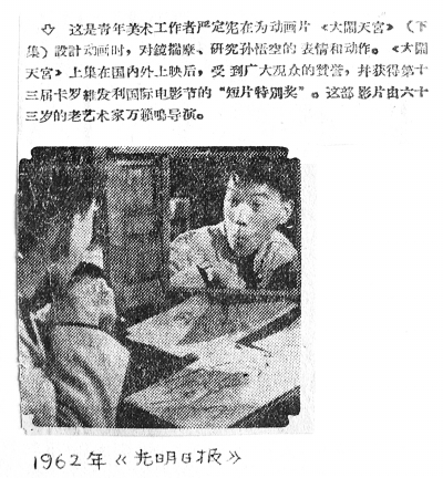 當(dāng)年,《大鬧天宮》的動(dòng)畫設(shè)計(jì)組每人桌上一面鏡子,對著鏡子揣摩表情、口型的變化。1962年,《光明日報(bào)》刊發(fā)了嚴(yán)定憲的工作照,這張剪報(bào)嚴(yán)定憲一直收藏至今。本報(bào)記者 顏維琦攝