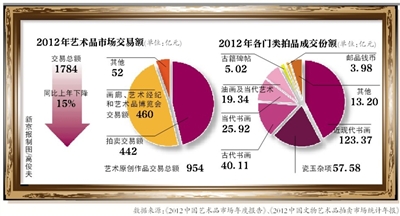 2012年我國藝術品市場在國內文化產業九大類中排名第一,占據了重要地位。在《報告》中指出,2012年我國藝術品市場整體行情出現明顯回調,市場交易總額為1784億元,同比下降15%。藝術原創作品仍是我國藝術品市場的最大交易品類,交易額達954億元,其中拍賣交易額為442億元(未將港、澳、臺等地區的市場成交額計算在內),畫廊、藝術經紀和藝術品博覽會的交易額為460億元。