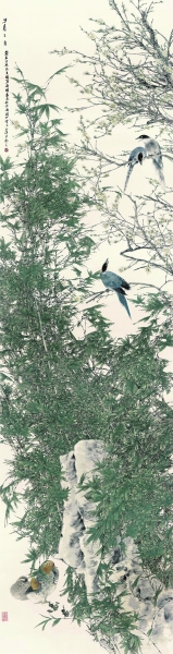 《早春三月》是姚大伍于壬辰年(2012)元月著手創作的,此作縱355厘米,橫94厘米,這件作品由藝術家耗時4個多月才得以完成。畫面描繪了江南早春的美景,有機地將喜鵲、叢竹、鴛鴦、太湖石繪制其中,內容豐富充實,構圖疏密有致,極富層次感。畫中叢竹茂密繁盛,梅花俏立枝頭,或含苞初展,或盛開怒放;喜鵲棲于梅梢,三兩成群,生機盎然;一對鴛鴦,一靜立蹲踞,一蜷首歇息,活靈活現。鴛鴦的靜,喜鵲的動,二者形成鮮明的對比,更顯示出江南早春寓動于靜、自然閑適的意境。畫家對生活觀察細致,藝術概括精煉,構圖設計別具匠心,達到了“花能解語鳥能言”的境界。