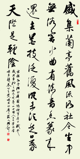 通過交談與觀賞其書作,便不難發(fā)現(xiàn)陳新絕對不是一個(gè)只會(huì)臨帖的“寫字匠”。他不是在“盲目臨帖”,或是在“把玩筆墨”,而是將書法藝術(shù)作為一門博大精深的學(xué)問來研習(xí)。因此,他既有感性的藝術(shù)實(shí)踐——臨帖與創(chuàng)作、又有理性的思考——將書法藝術(shù)升華到美學(xué)與哲學(xué)的高度來進(jìn)行深度審視與觀照。近些年陳新書藝突飛猛進(jìn),屢屢獲獎(jiǎng)并見諸報(bào)端,佳績頻出,令人矚目。這首先在于他取法乎上,廣涉博覽,不囿舊法,不拘陳規(guī),日日臨池,轉(zhuǎn)益多師。其次,得益他廣拜良師,遍結(jié)益友。他早年拜蔣維崧、魏啟后等名家為師,后又得到啟功、武中奇、沈鵬、歐陽中石等書壇耆宿指點(diǎn),由是眼界大開,書藝迅進(jìn)。再次,他雅好京韻,興趣廣泛,以“讀萬卷書行萬里路”為藝術(shù)創(chuàng)作之準(zhǔn)則,道法自然,造化胸次,也是其走向成功的一個(gè)不可或缺的重要原因。