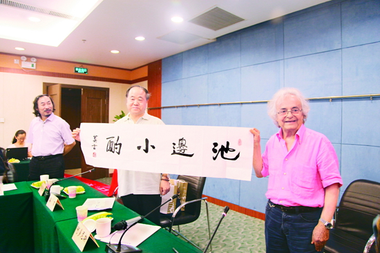 對談結束后,莫言將自己寫有“池邊小酌”的書法作品贈與阿多尼斯(右),期待再有機會與他“小酌”