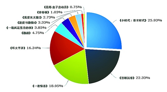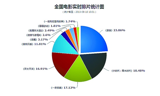 和《小時代1》首映日當天45.1%的排片率相比,《小時代2》的排片率已經萎縮了許多。8月8日,《小時代2》提檔上映,正遇《一場風花雪月的事》。目前,《小時代2》保有全國影院20%左右的放映空間,累計票房2.48億元?!秾m鎖沉香》憑借萬達院線的力挺,全國排映率也基本保持,首日票房為2340萬元。而《一夜驚喜》憑借二、三線城市的票倉,全國排映蓋過了《環(huán)太平洋》,累計票房1.1億元。