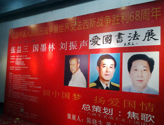 紀念中國人民抗日戰爭暨世界反法西斯戰爭勝利68周年當代名家愛國書法展由八路軍老戰士文工團主辦,承辦八路軍老戰士文工團創研部和藝谷美術館,展期8月15日至8月25日。